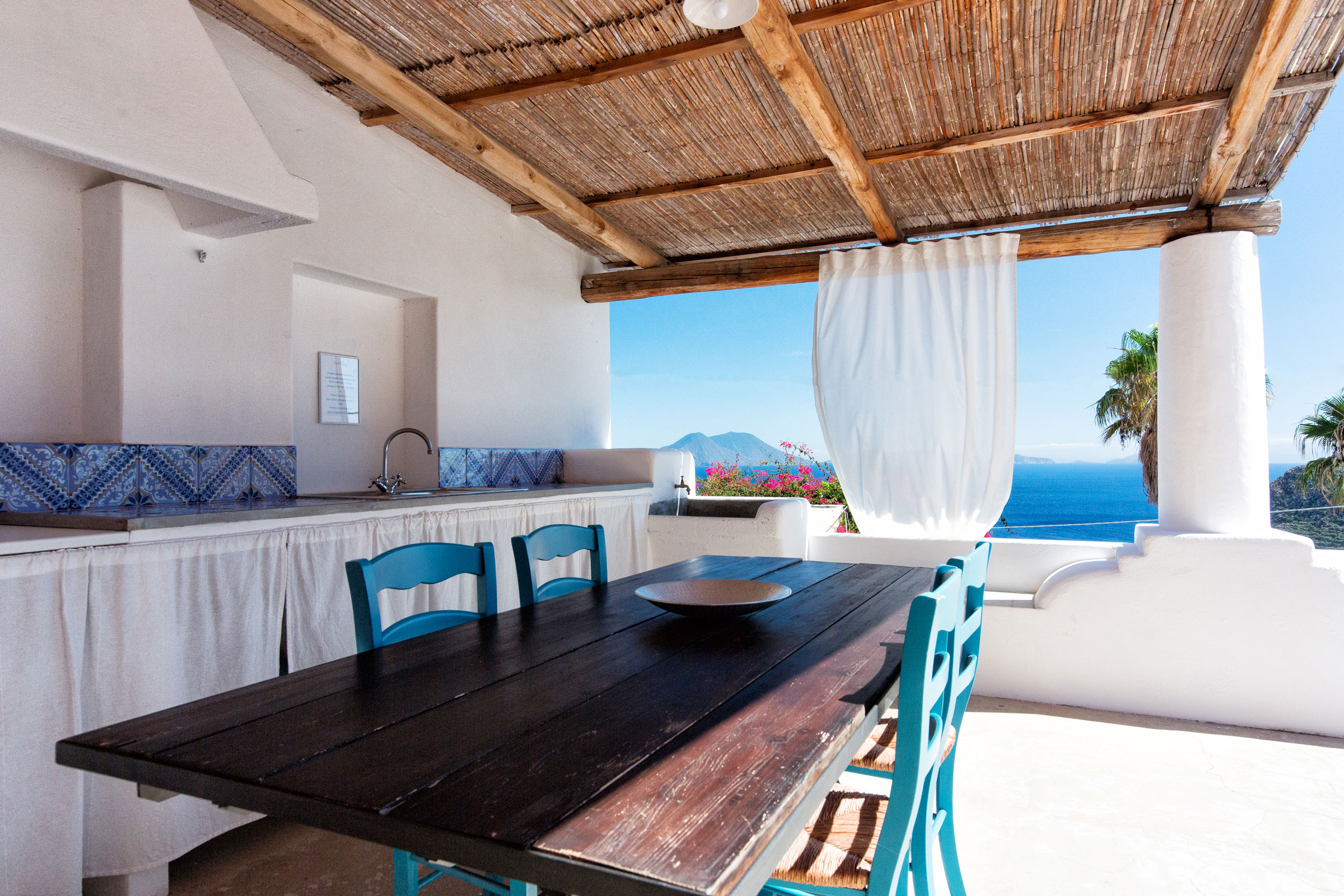 Each space is designed to blend in with the surrounding nature, respecting the typical architecture of the island. The simple and elegant interiors tell the spirit of the Aeolian Islands: natural materials, earthy colors and open spaces overlooking the sea and the greenery. The private terraces, wooden ceilings and essential design create an intimate and relaxing atmosphere, where every detail is designed for your well-being.